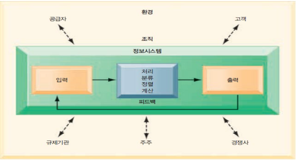| 💡 MEMO 정보시스템은 조직과 조직의 주변 환경에 대한 정보를 담고 있다. 입력, 처리, 출력의 세 가지 기본 활동이 조직이 요구하는 정보를 생산한다. 피드백은 입력을 평가하고 정제하기 위하여 조직의 담당자나 관련 활동에 반송하는 출력을 말한다. 고객, 공급자, 경쟁자, 주주, 규제기관 등과 같은 외부 영향 요인은 조직 및 정보시스템과 상호작용을 한다. |