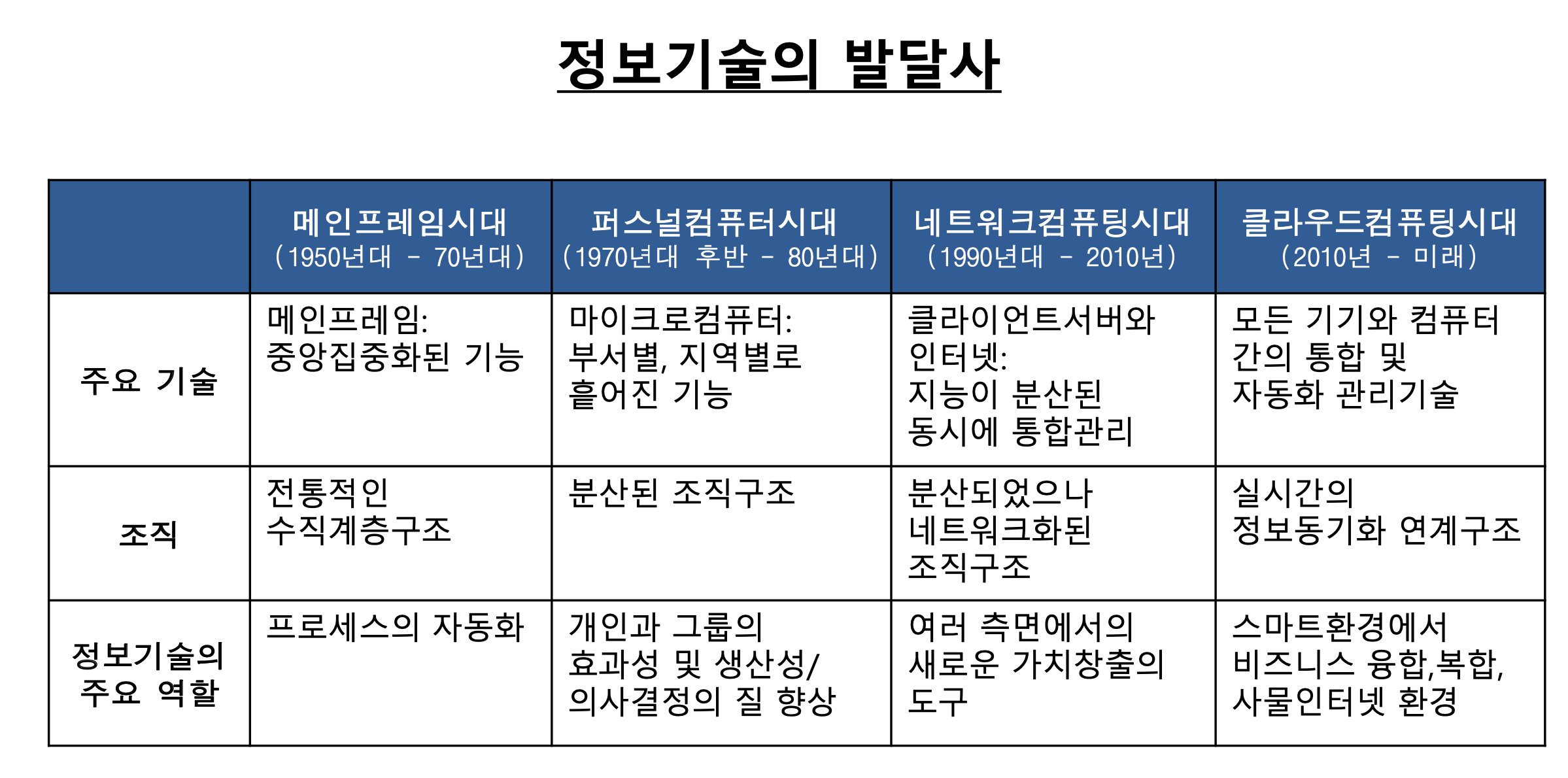 정보기술의 발달사는 메인프레임시대, 퍼스널컴퓨터시대, 네트워크컴퓨팅시대, 클라우드컴퓨팅시대로 나눠진다.